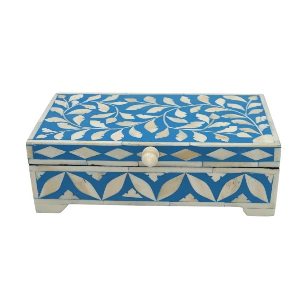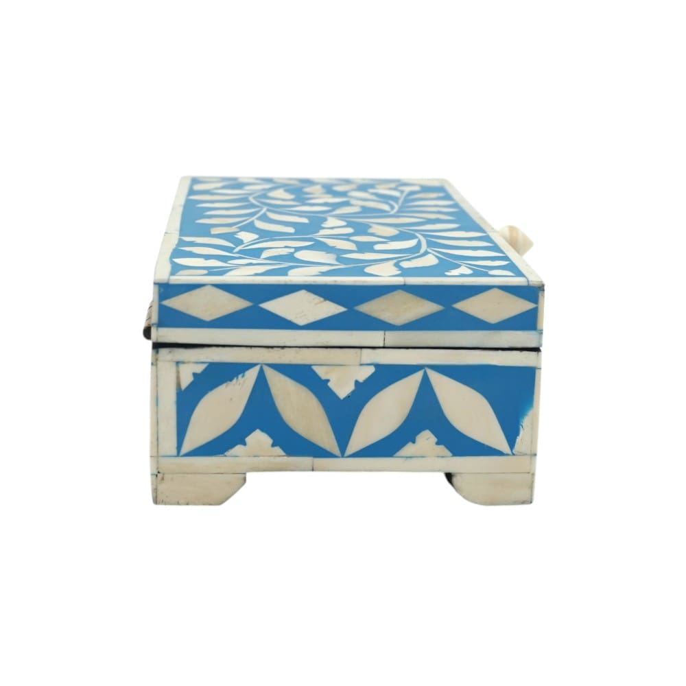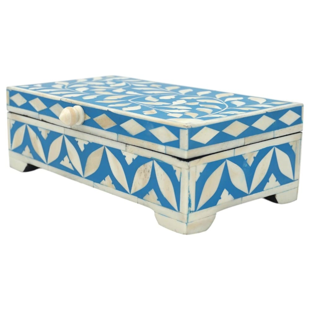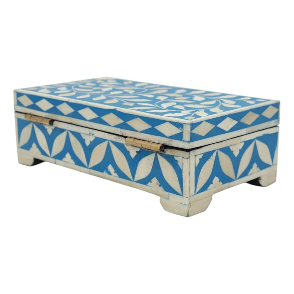 Hand-crafted bone inlay blue and white keepsake box, a captivating work of art meticulously hand-crafted using traditional techniques.