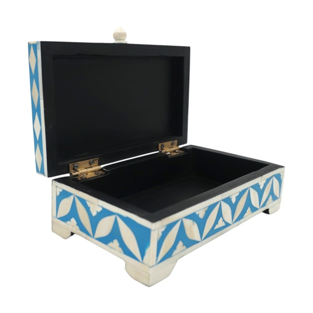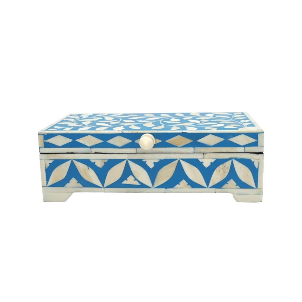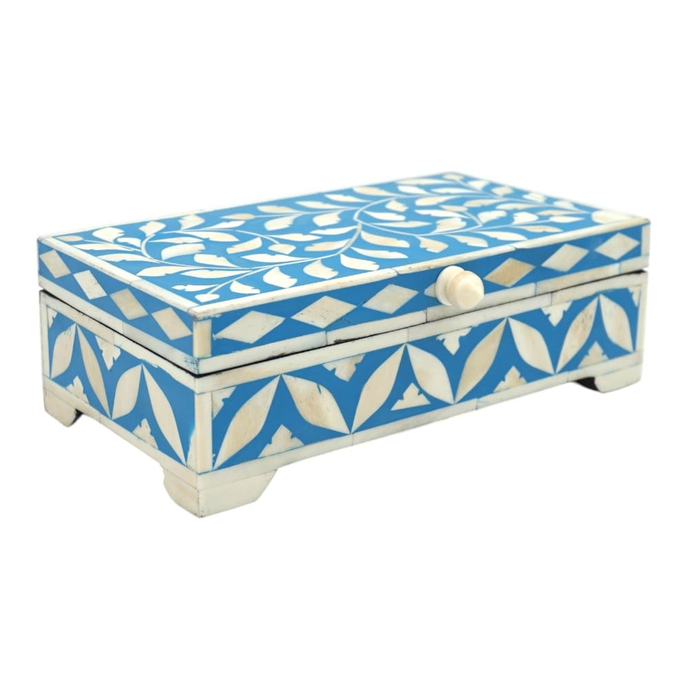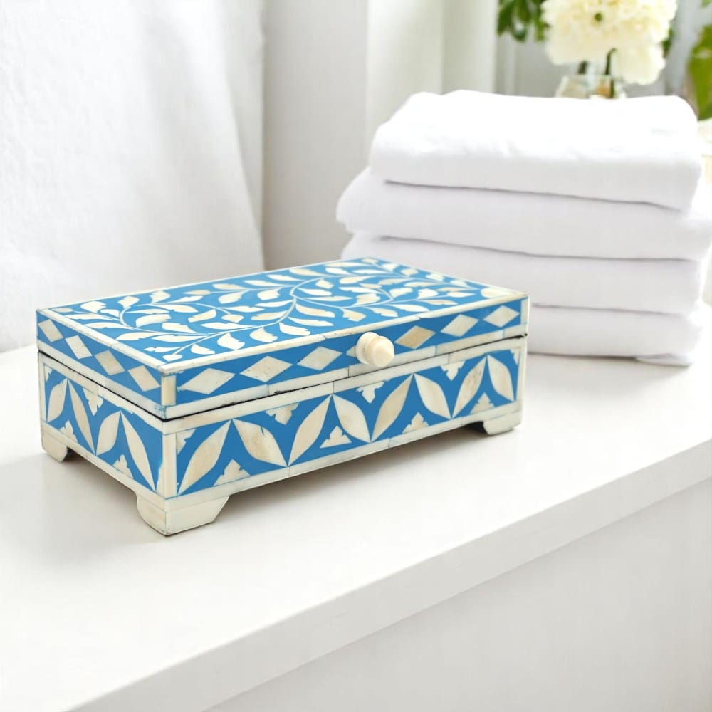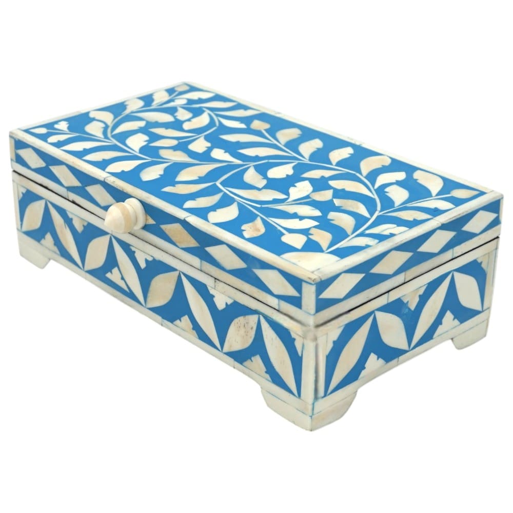 Hand-crafted bone inlay blue and white keepsake box, a captivating work of art meticulously hand-crafted using traditional techniques.