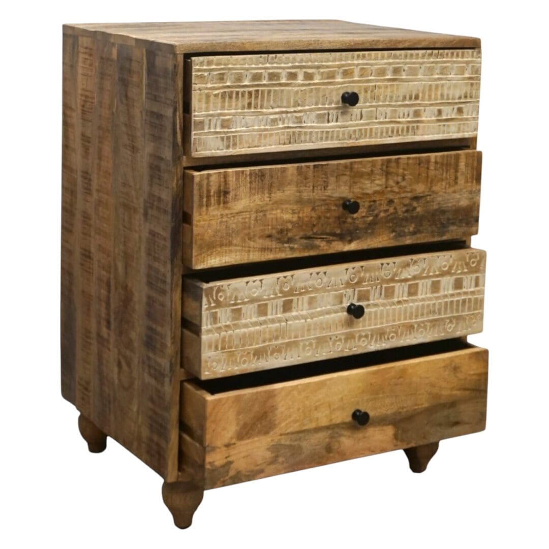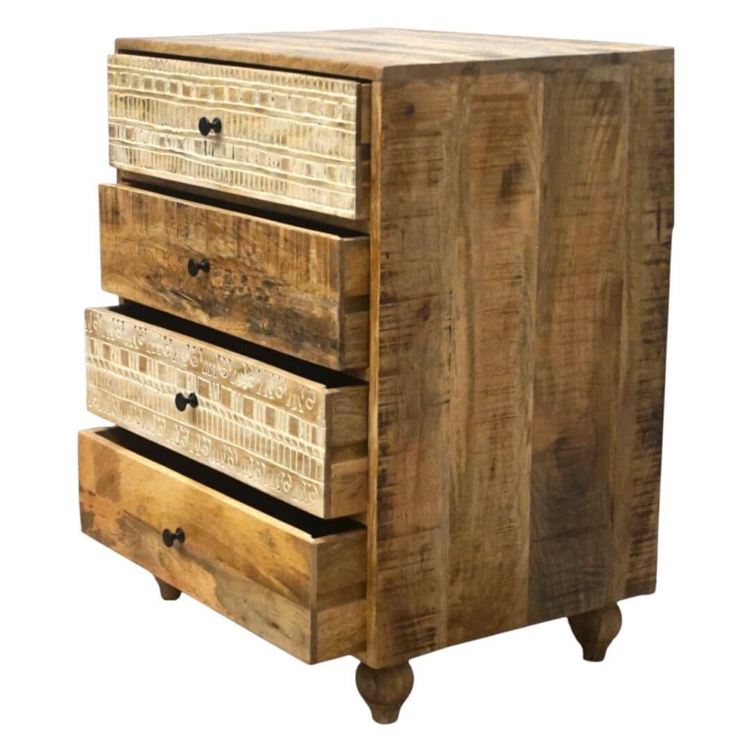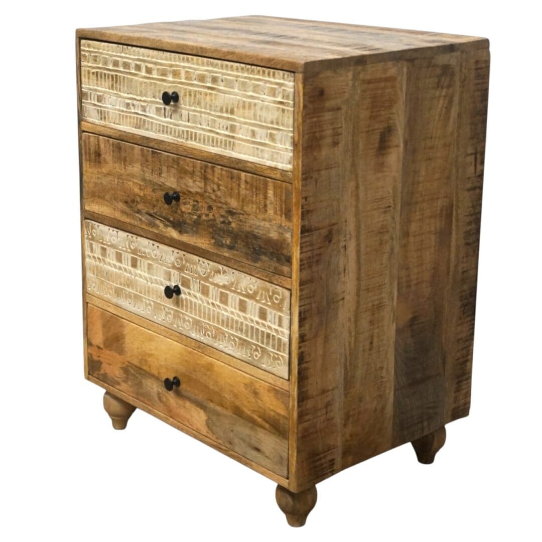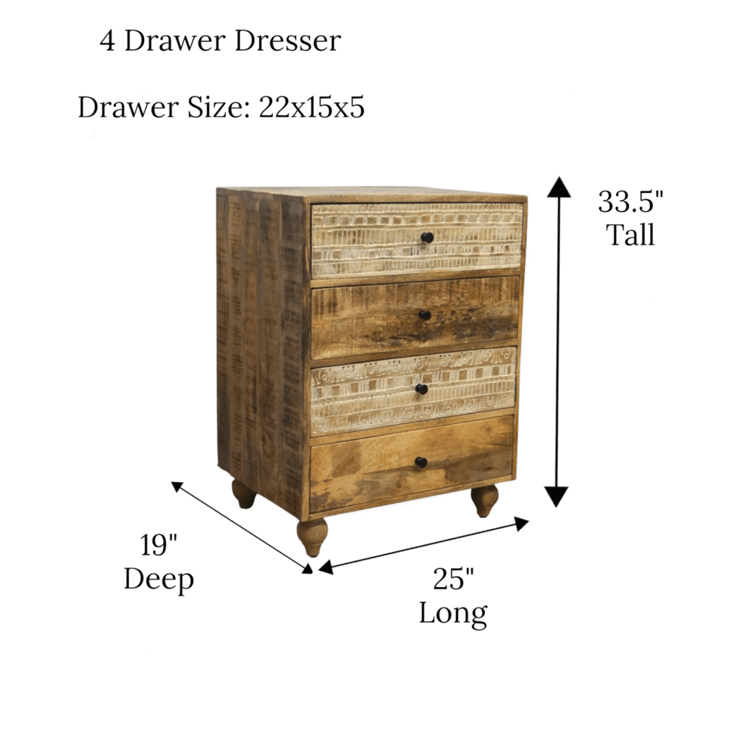 Hand-crafted from solid mango wood, this stunning rustic hand-carved dresser is the perfect addition to any home. With intricate designs and different textured wood, this piece is simply beautiful. Match it with our other pieces to complete your look. 4 deep drawers make this a functional work of art.