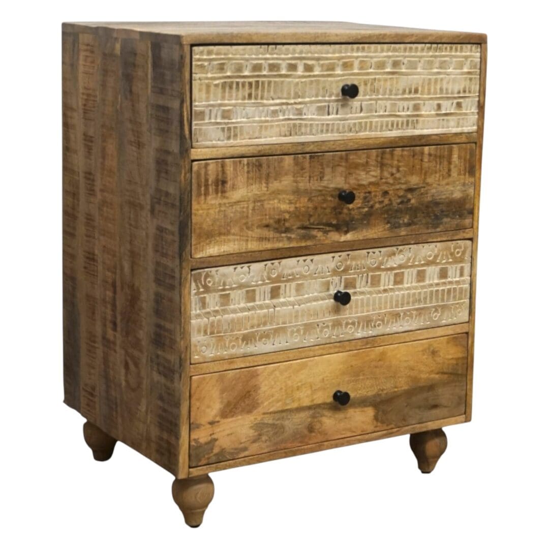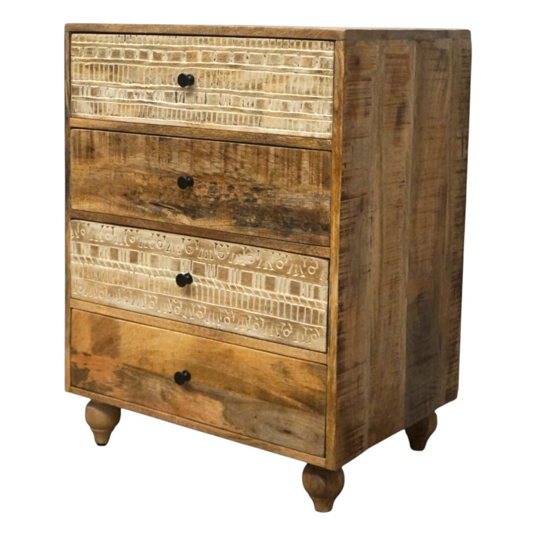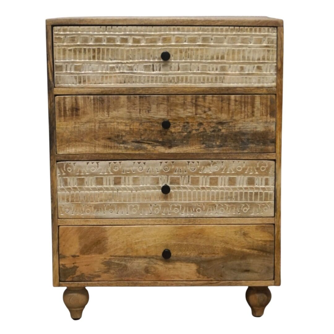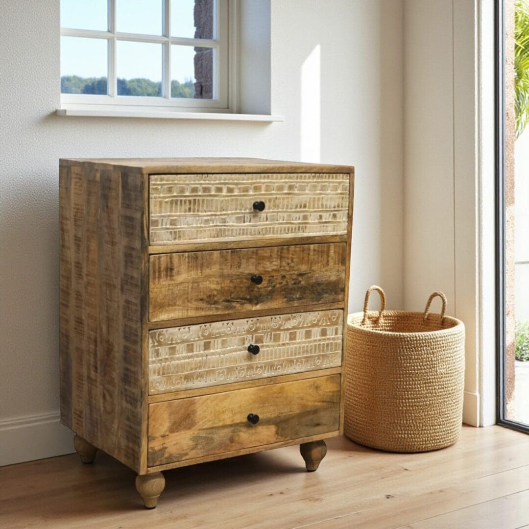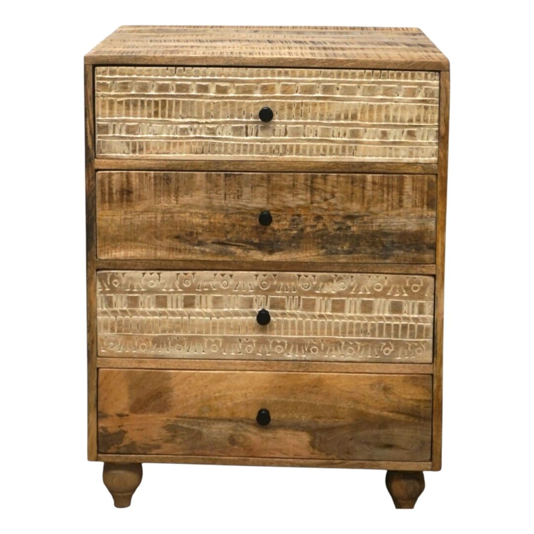 Hand-crafted from solid mango wood, this stunning rustic hand-carved dresser is the perfect addition to any home. With intricate designs and different textured wood, this piece is simply beautiful. Match it with our other pieces to complete your look. 4 deep drawers make this a functional work of art.