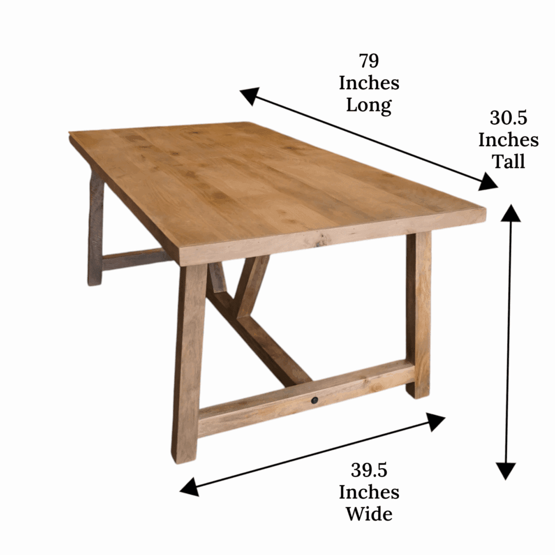 Minimal assembly is needed. A simple yet timeless, unique accent for your home. At 79 inches long, 39.5 inches wide, and 30.5 inches tall, this dining table has ample room for all your family gatherings.
